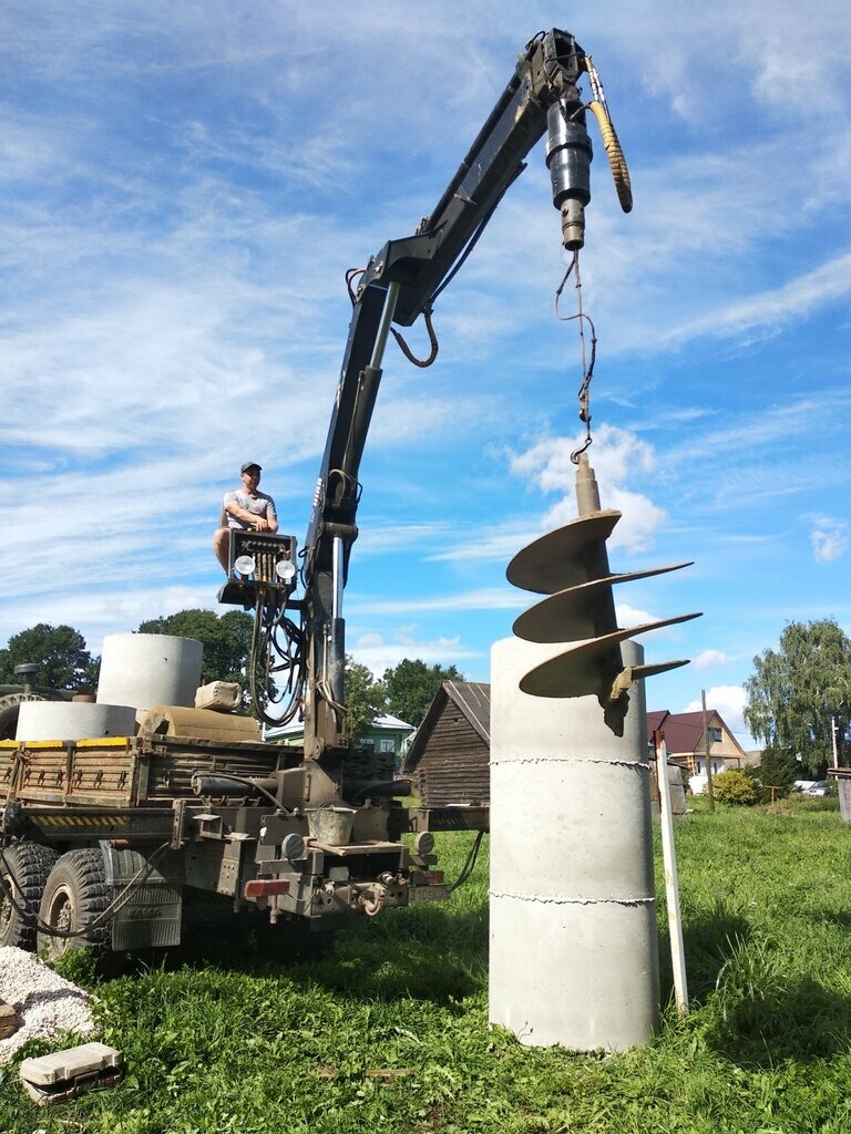 Устанавливаем буровую технику на подходящем месте, подбираем шнек нужного диаметра и копаем шахту. Разрабатываем и аккуратно складируем грунт. При появлении водно-песчаной смеси меняем бур, устанавливаем обсадные кольца и продолжаем бурение колодца до основного водоносного слоя. При достижении необходимой глубины убираем ямобур, проверяем вертикальность и ровность стенок шахты, очищаем и подготавливаем ее к установке жби колец.
